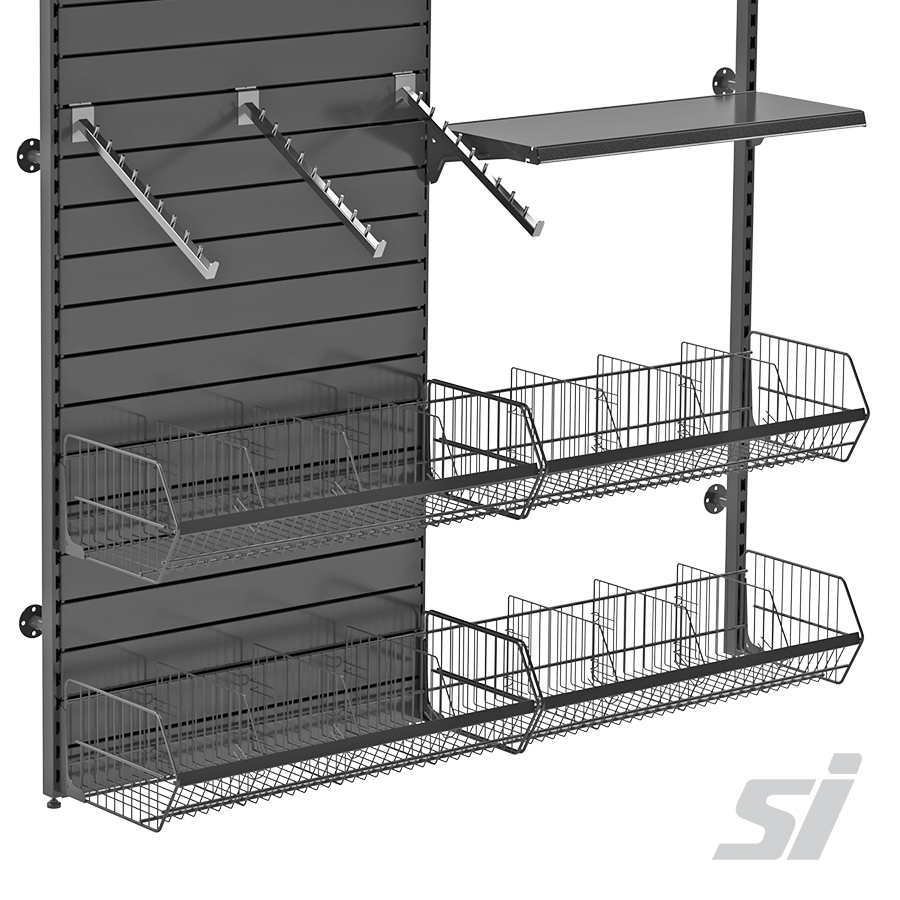 Sized 400mm D x 914mm L, each wire display basket has integrated brackets that allow the basket to attach to SI Retails' 914mm wide Versa Gondolas and Versa Slotted Post Wall Display (50mm Pitch).